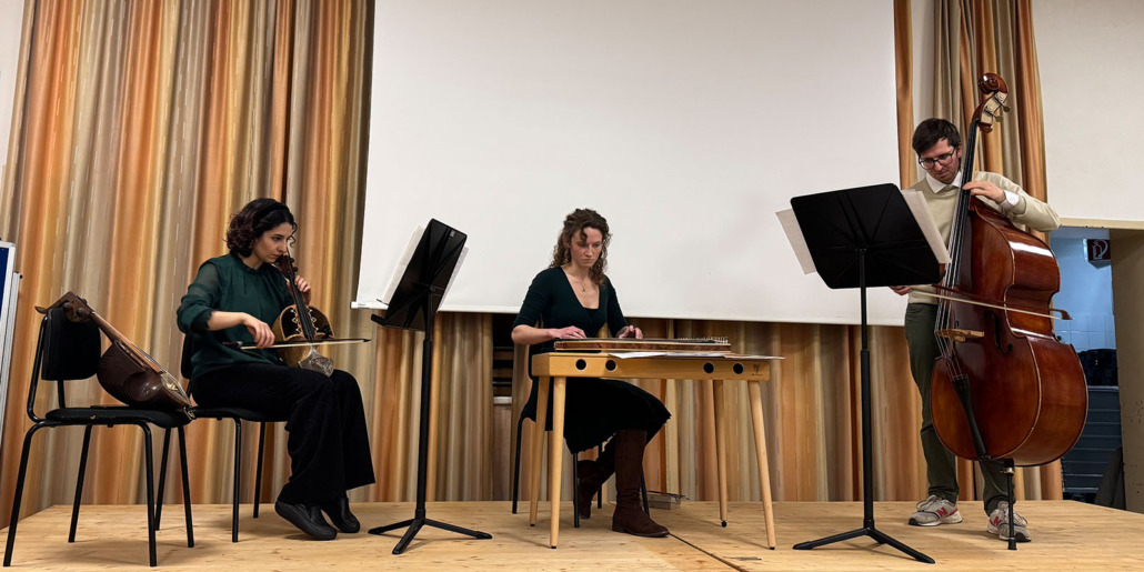 Das interkulturelle Trio Trifolium formierte sich aus Studierenden des Masterstudiums Ethnomusikologie an der mdw. Die 3 Musiker*innen Anna Karnthaler (Wiener Zither), Paul Marquardt (Kontrabass) und Parmis Rahmani (Gheychak) verbinden mit ihrem Ensemble unterschiedliche musikalische Traditionen und Klangwelten. Mit ihrem interkulturellen Konzept beschränkt sich das Trio nicht nur auf ihre Instrumente, sondern möchte mit seinem Repertoire auch Musik aus verschiedenen Kulturen spielen.